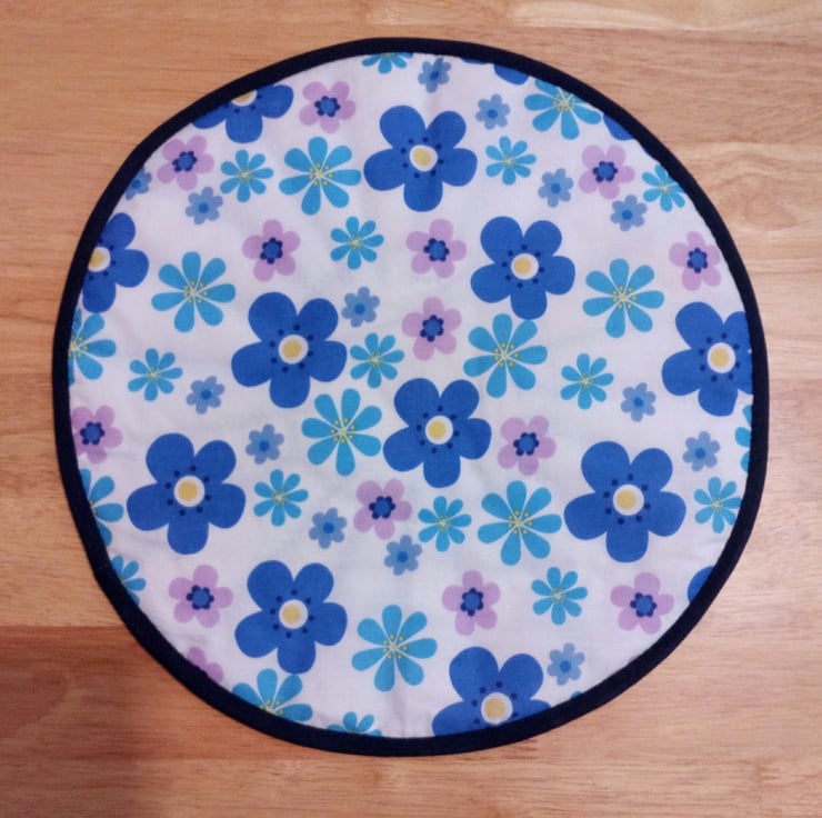 The mat is in a blue theme and has a bias binding edging with a polyester wadding filling.