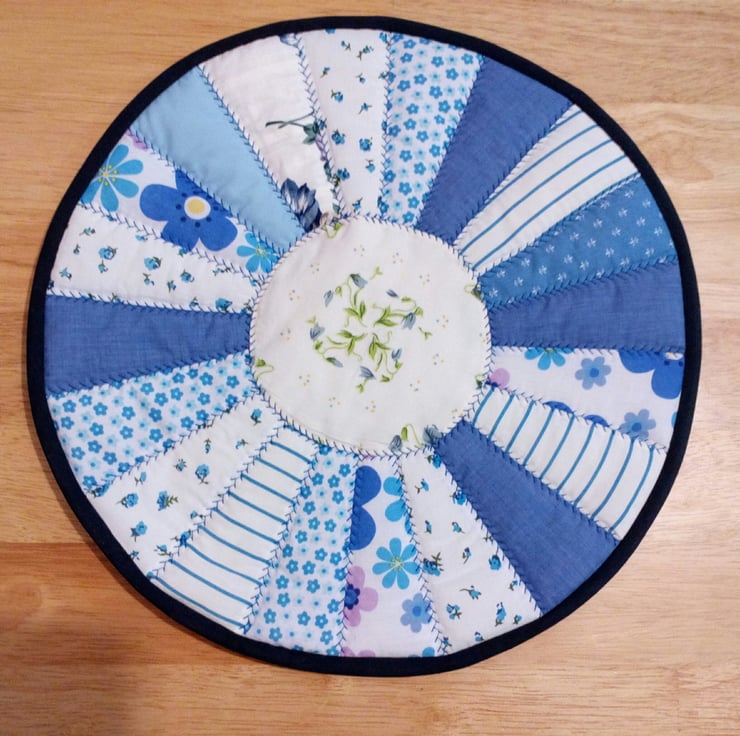 This is a round patchwork & quilted table mat in a Dresden plate design which can be used as a placemat or table centrepiece.