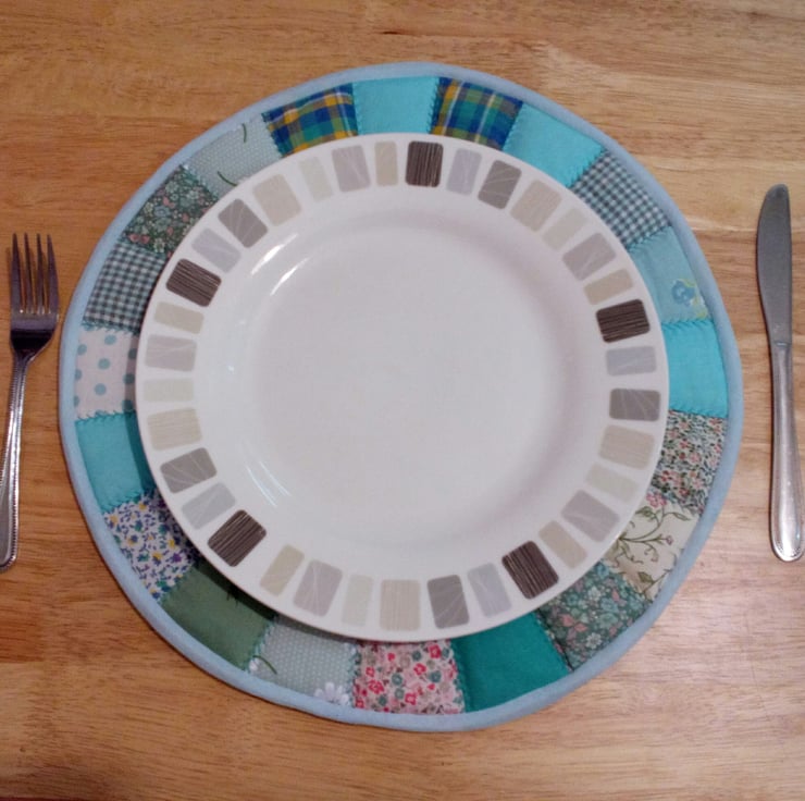 This is a round patchwork & quilted table mat in a Dresden plate design which can be used as a placemat or table centrepiece.