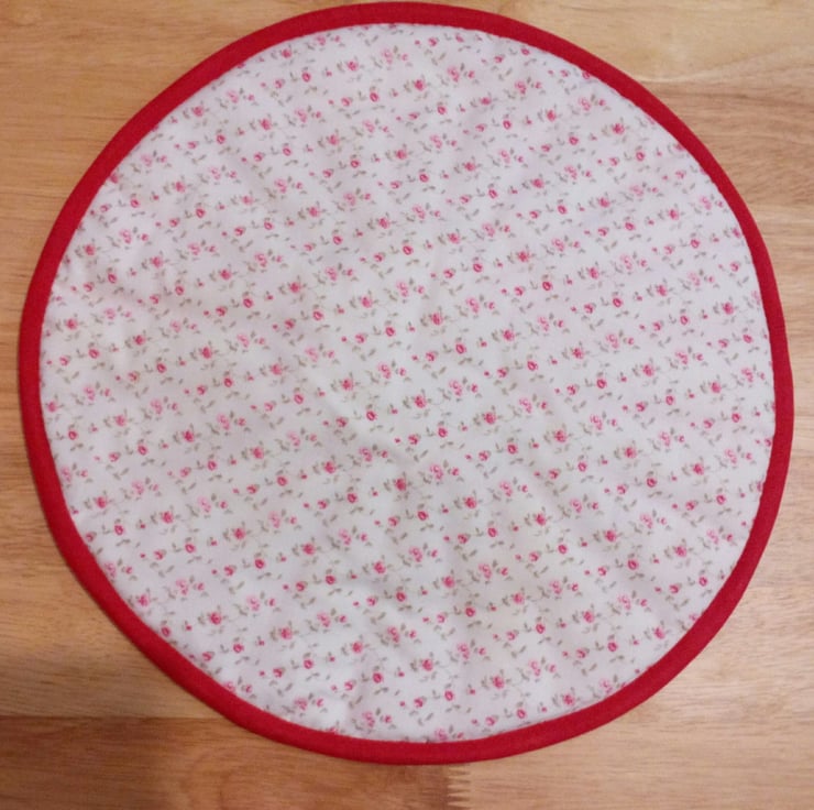 The mat is in a red theme and has a bias binding edging with a polyester wadding filling.