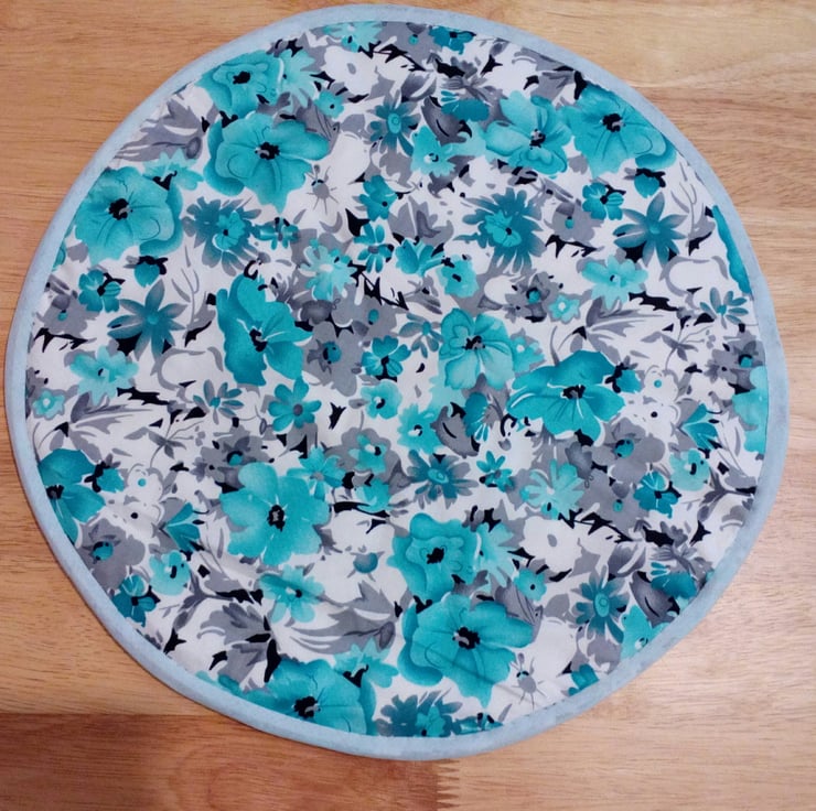 The mat is in a turquoise theme and has a bias binding edging with a polyester wadding filling.