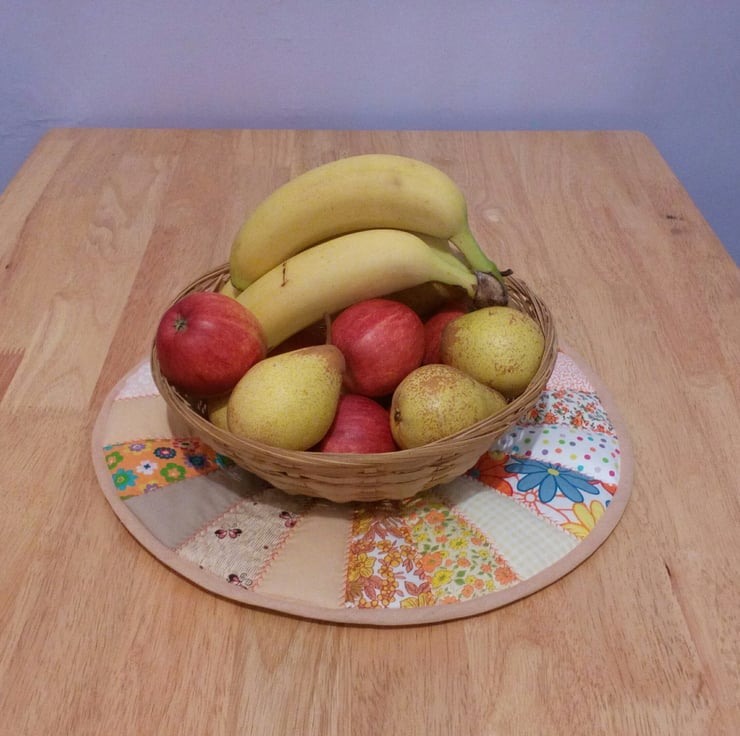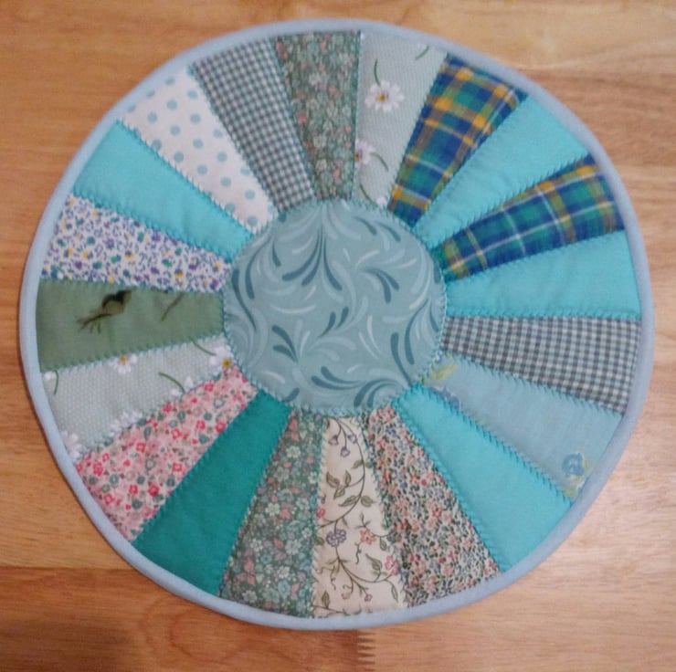 This is a round patchwork & quilted table mat in a Dresden plate design which can be used as a placemat or table centrepiece.
