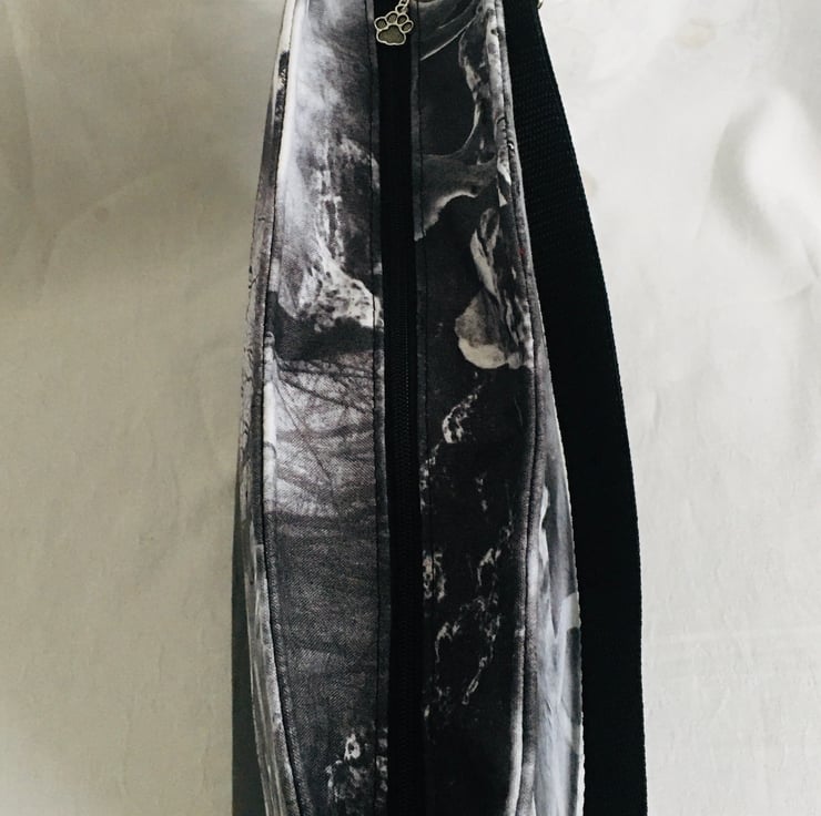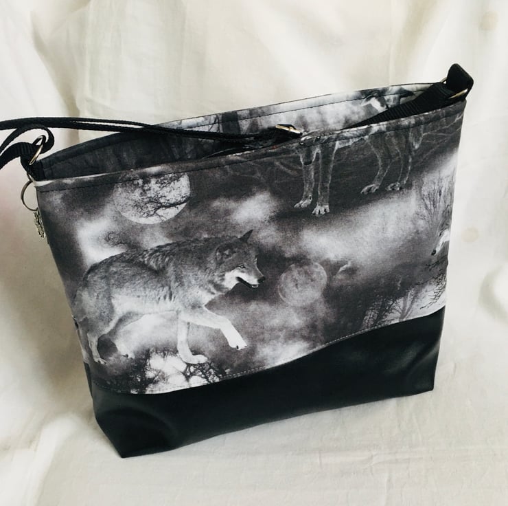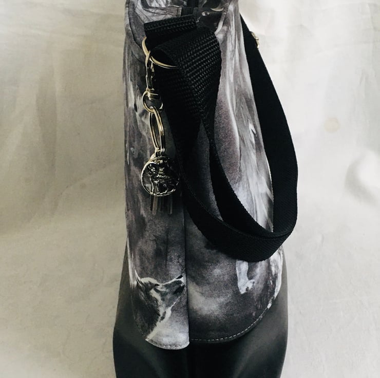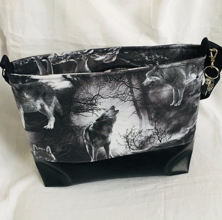 This is a simple yet stunning style bag. This bag can easily be worn crossbody or over the shoulder, due to its fully adjustable strap. A bag with plenty of room for all your essentials, with a zip closure along the top of the bag. The bag has been made using dense weave cotton for the top with Wolves print and backed with stabilizer to keep it's form. The base of the bag is faux leather, giving strength and stability. The handle is a strong nylon webbing and fully adjustable. Finally a clip charm with tassel and wolf charm.
