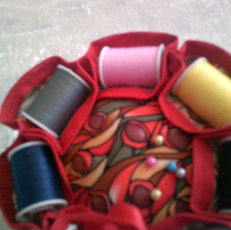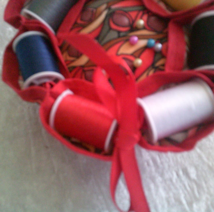 The design on this pin cushion is a Mackintosh style fabric in Red, Gold and Dark Grey.