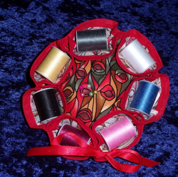 Made using two circles of cotton fabric, then edged with contrasting bias binding, it is stuffed using soft toy stuffing before the cotton reels are threaded onto ribbon and tied in a bow to stop them falling off, then this cotton reel pin cushion is an ideal addition to your sewing kit.