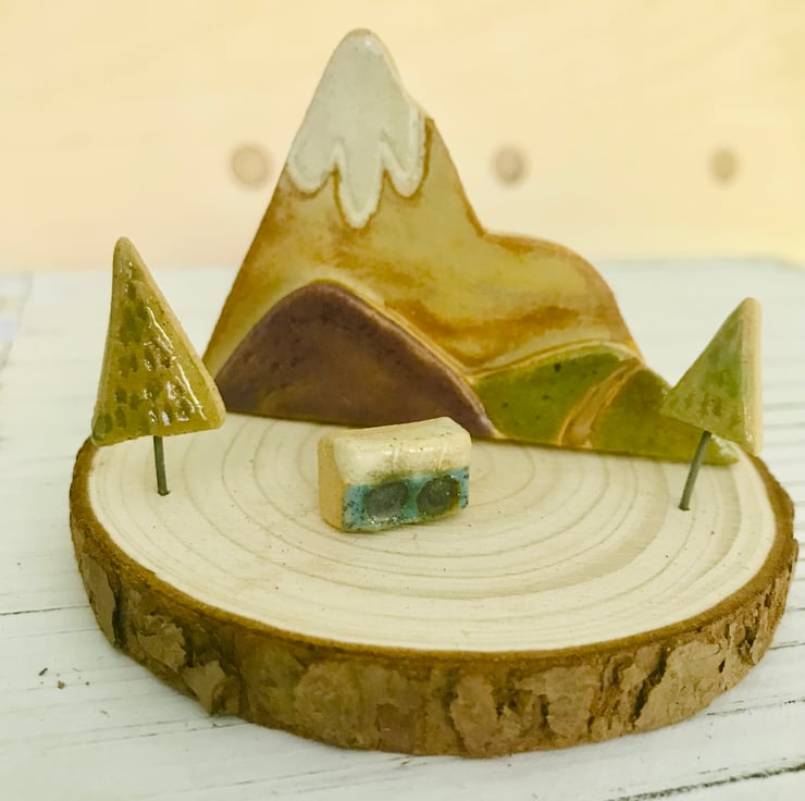 Wooden base approximately 8cm in diameter. Mountain approximately 4.5cm in height. Comes flat packed for self assembly. 2 wire mounted trees, a wire mounted van and a wire mounted mountain. Made for stoneware clay.