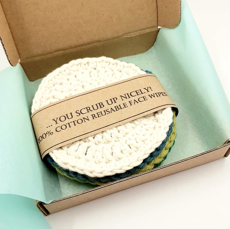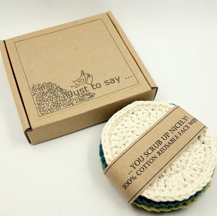 The set of scrubbies comes wrapped in tissue in a labelled PIP (Postage in Proportion) box and would make a lovely gift and even a novel alternative to a greetings card! The front of the box reads 'Just to say ... and the label around the scrubbies finishes the sentence with the words '... you scrub up nicely!'
