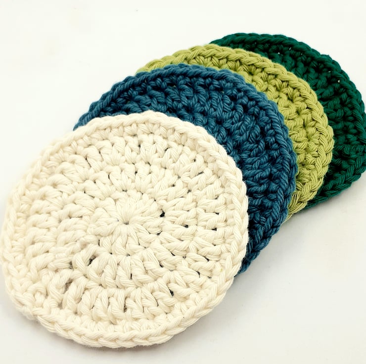 These four pretty face scrubbies are crocheted in cotton and measure approximately 7.5 cm in diameter. Perfect for use with soap and water or makeup remover. They can be popped in a laundry bag and washed at 40 degrees, reshaped whilst wet and they are ready to use again!