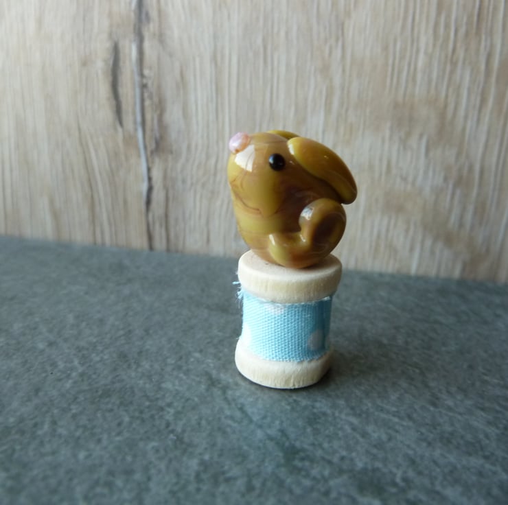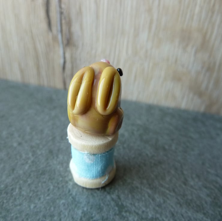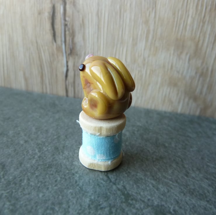 A wooden spool wrapped with blue fabric, it features a handmade lampwork glass hare on the top.