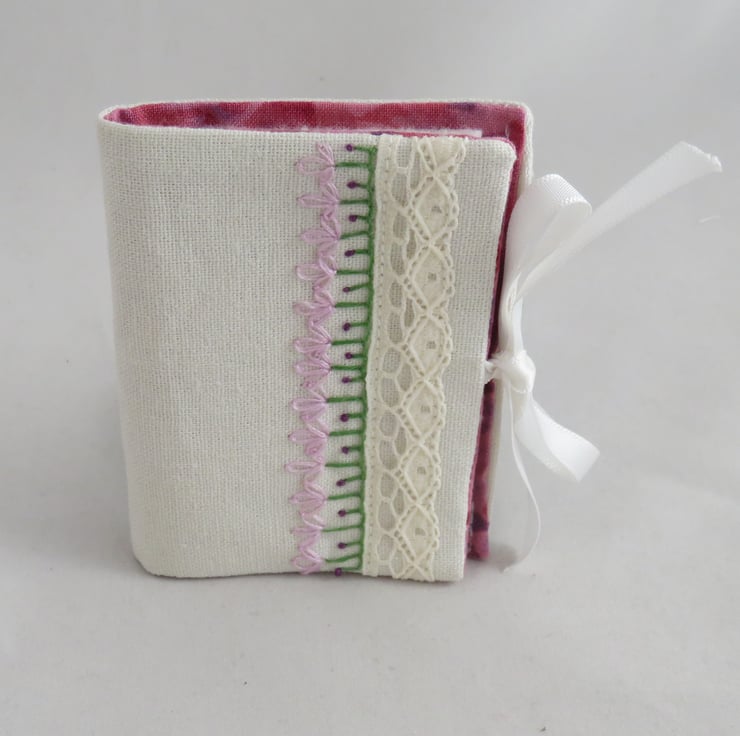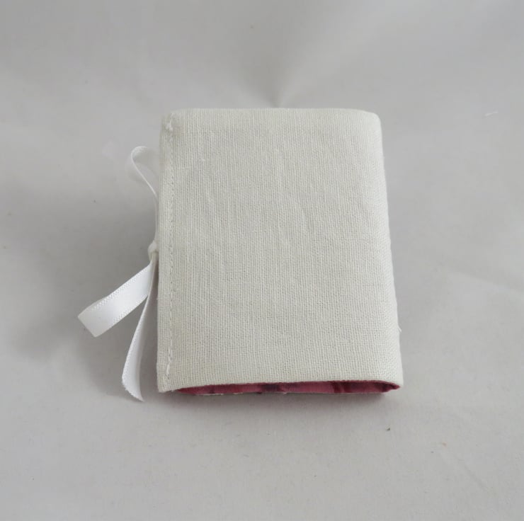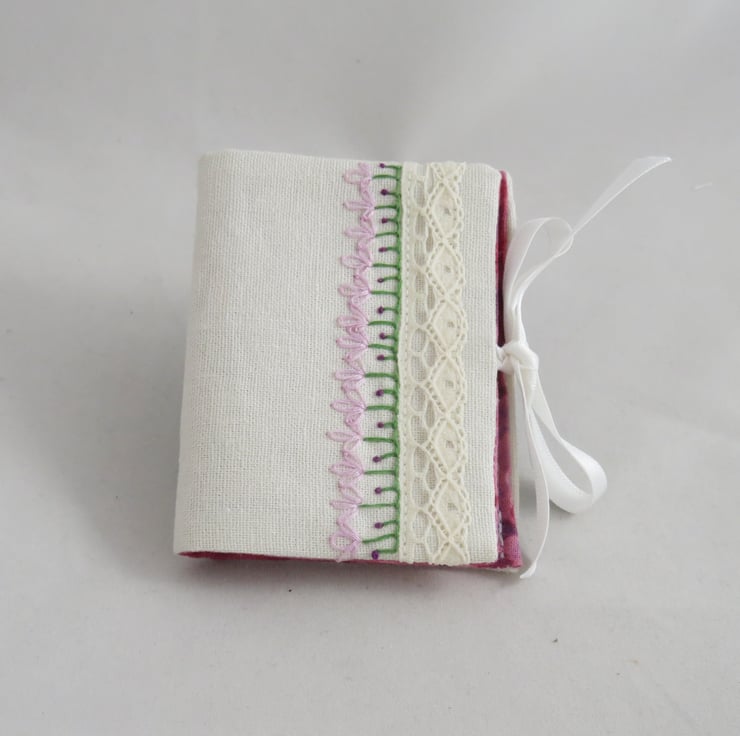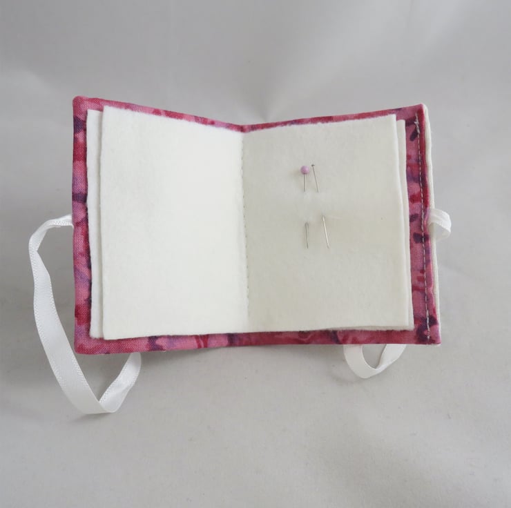 The needle book is lined in a pink and purple cotton fabric. Two pieces of white felt are folded and securely stitched in place, to provide four 'pages' for your needles and pins. The needle case closes by a tying a bow in white satin ribbons.
