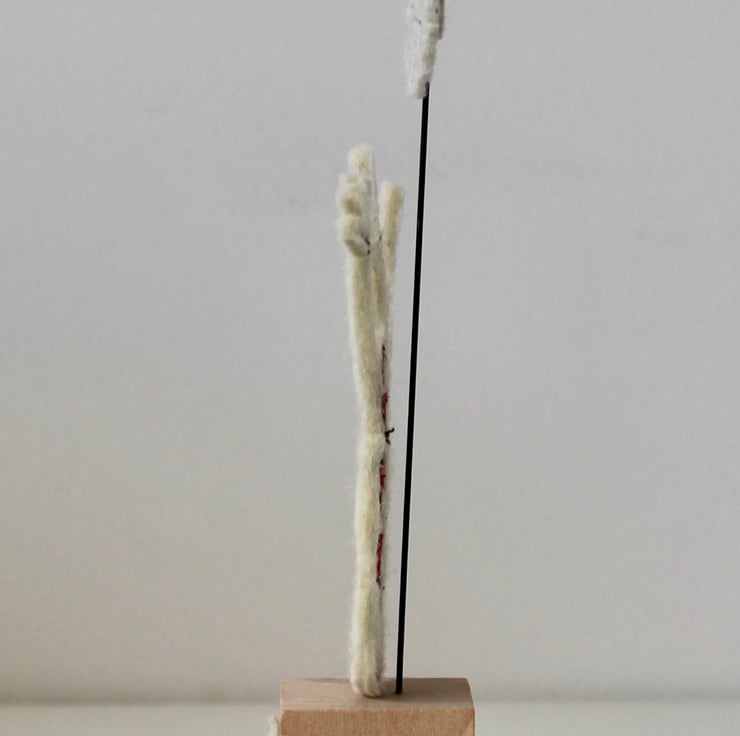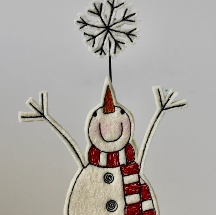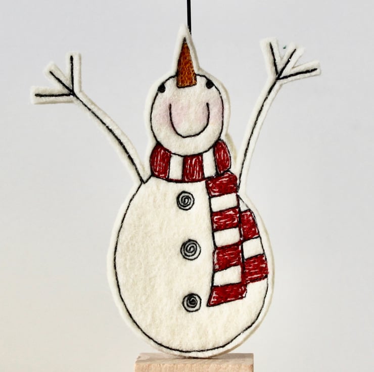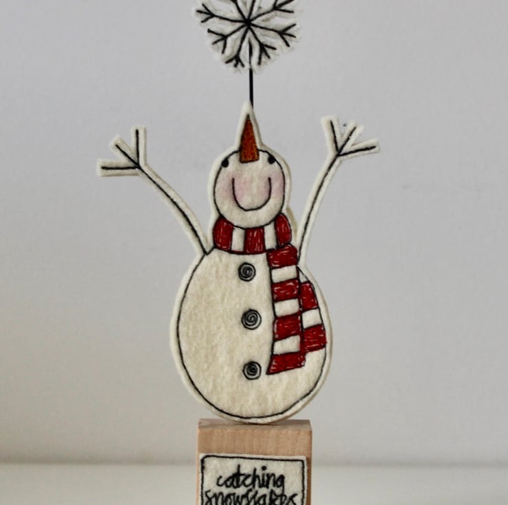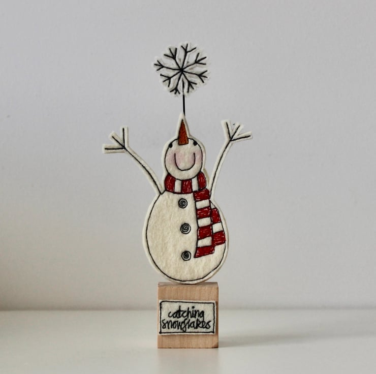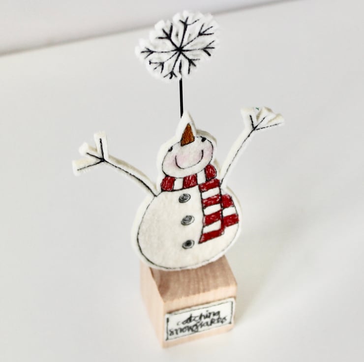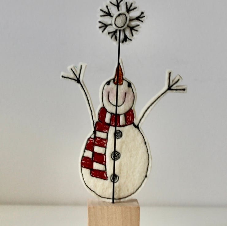 Mr Snowman is created using 100% wool felt, free hand machine embroidery and cut out by hand using very sharp scissors. He is mounted on a 3cm cube wooden block, which can adorn a mantle piece or any flat surface.