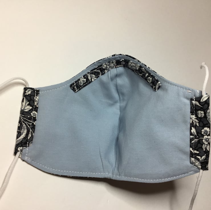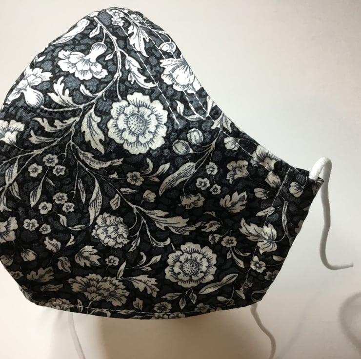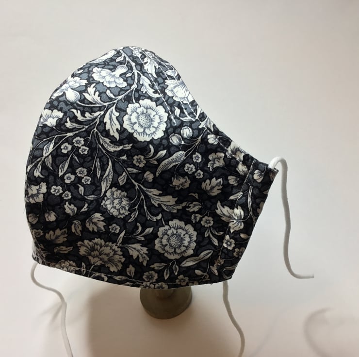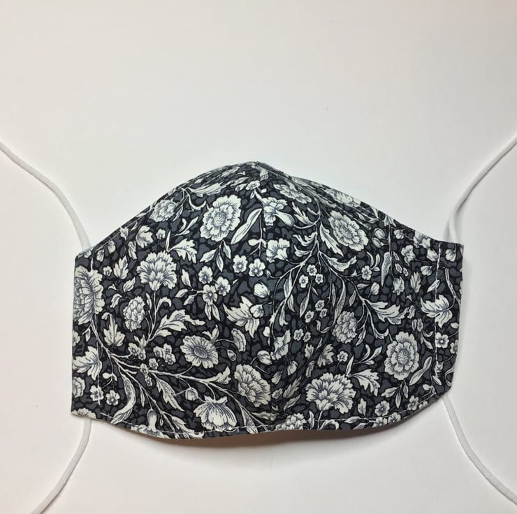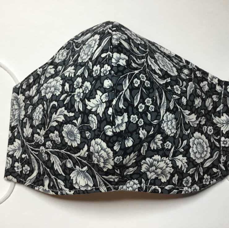 Pretty black and white floral face covering made with 3 layers of cotton fabric, a removable nose wire and soft white elastic ear loops with 30cm each side for you to adjust to size. If you would prefer black elastic please select from drop down option box.