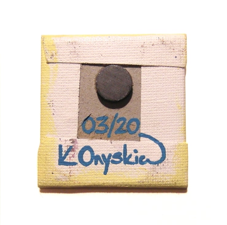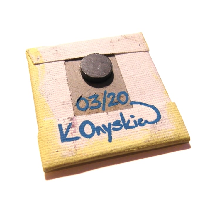 This original pysanka design by Kim Onyskiw is painted in acrylics on a 5cm x 5cm (2" x 2") canvas board, The mini painting has been coated with a layer of clear varnish to make it more durable, and a 12mm magnet is attached to the back so the little piece of art can stick on a fridge or other magnetic surface.