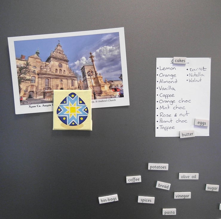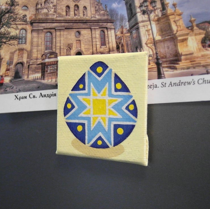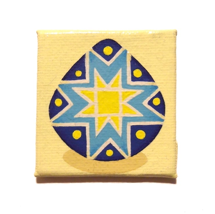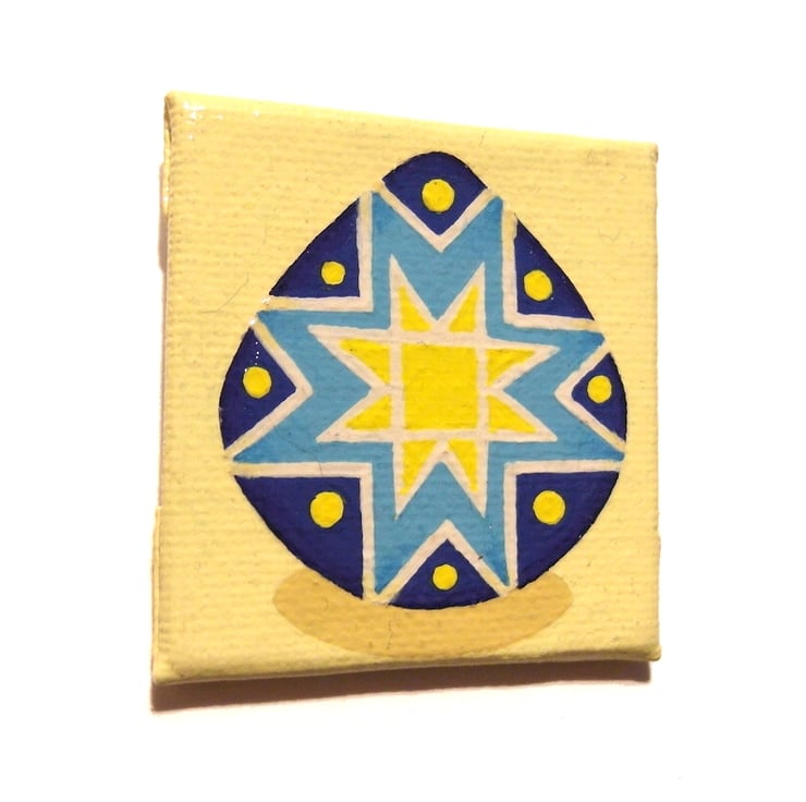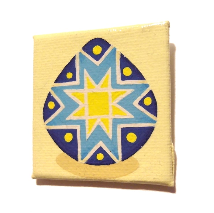 A small magnetic acrylic painting featuring a blue and yellow pysanka - a traditional Ukrainian decorated egg. The colourful egg has a star pattern and is sat on a pale yellow background.