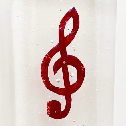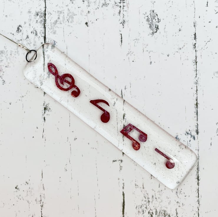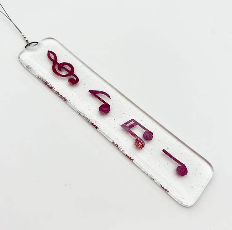 To make this glass suncatcher, I started by hand cutting musical note shapes out of very thin copper foil, using a scalpel. Then I cut 2 long rectangles from transparent art glass. The foil is sandwiched between the 2 layers of glass and fused overnight in my kiln. When it's fired in my kiln, the copper turns to a lovely deep red colour. Each note is handcut, therefore no 2 are exactly the same.