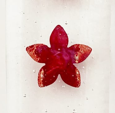 To make this glass suncatcher, I started by cutting flower shapes out of very thin copper foil, using a scalpel. Then I cut 2 long rectangles from transparent art glass. The foil is sandwiched between the 2 layers of glass and fused overnight in my kiln. When it's fired in my kiln, the copper turns to a lovely deep red colour. Each flower is handcut, therefore no 2 are exactly the same.