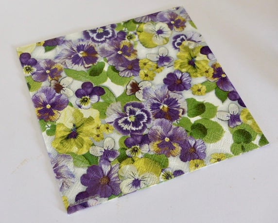 Four different 3 ply paper napkins measuring 33cm square - Magnolias, Roses on a black background, white daisies on a grey background and purple violas. Ideal for craft projects, decoupage etc. They will be sent by Royal Mail packed with recycled card for protection.