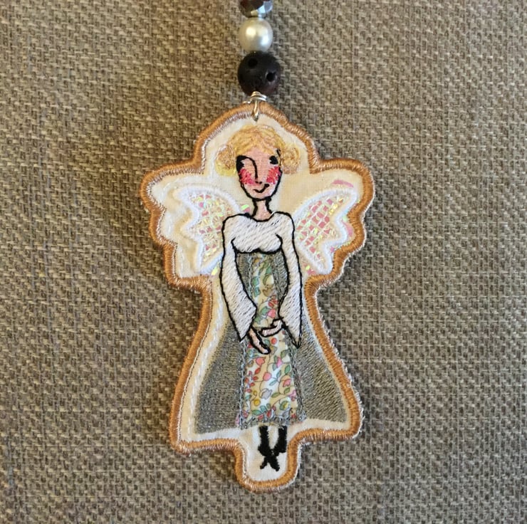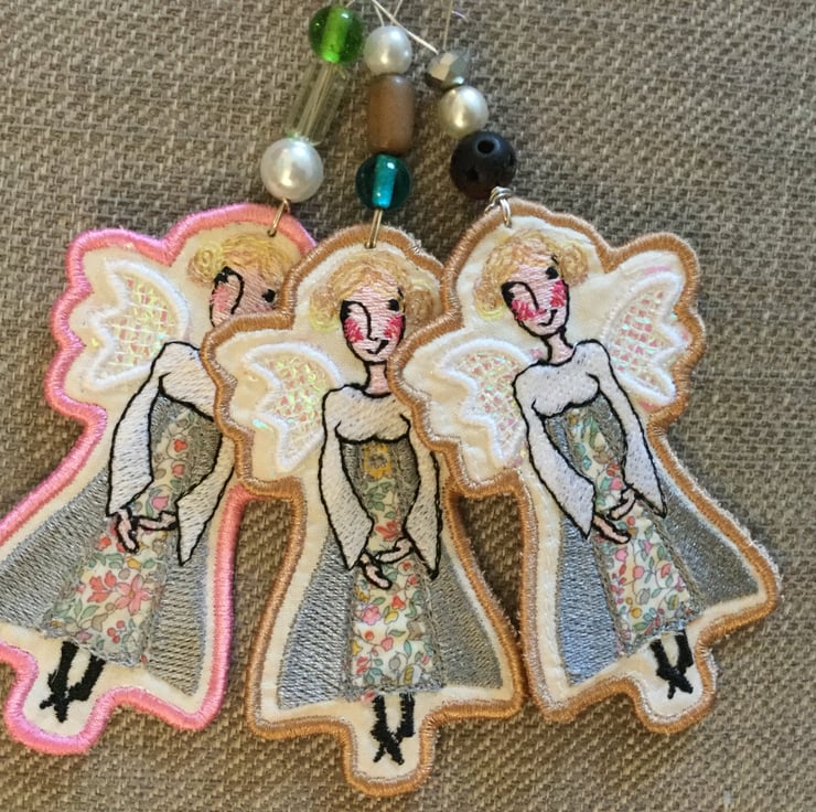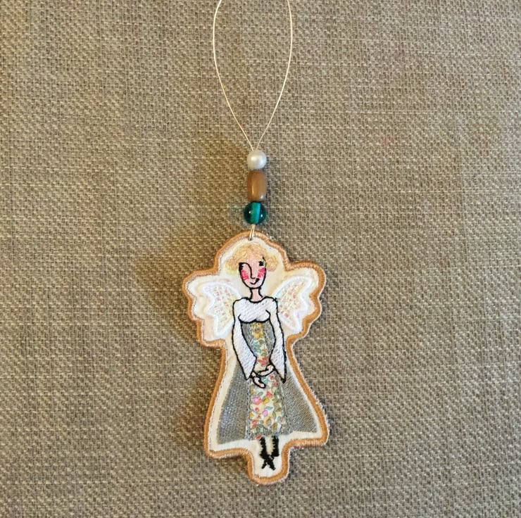Hanging embroidered angel, with a beaded wire hanger. She has glittery wings. Looks lovely hanging in the home, or as a Christmas decoration for the tree or wreath. Could be used as a gift tag, to add a little extra to a present. Size 4 ins, and 7.5 ins with the hanger added.