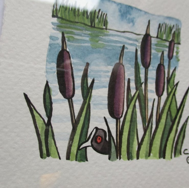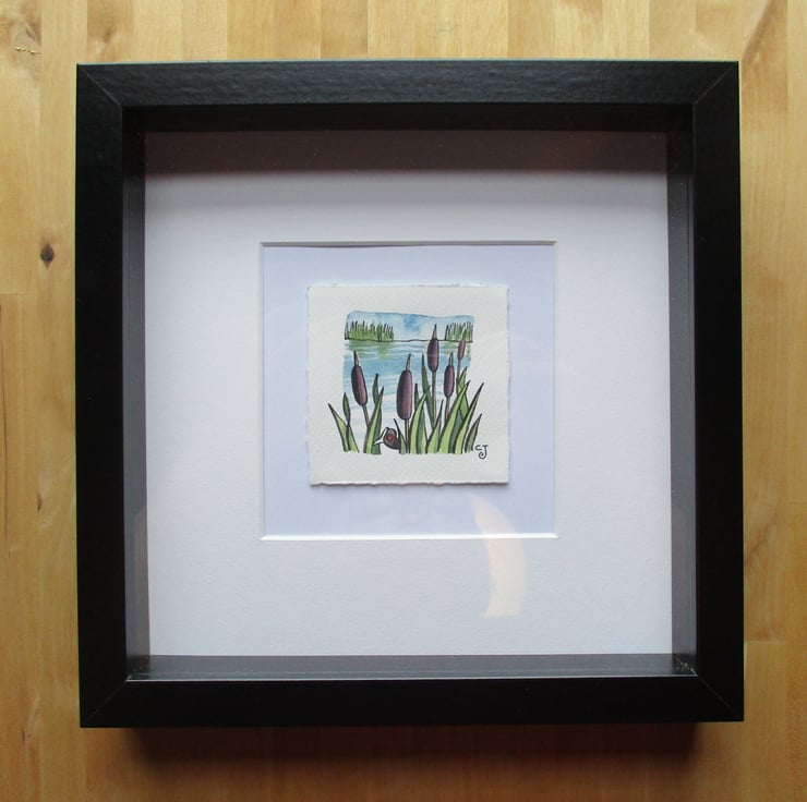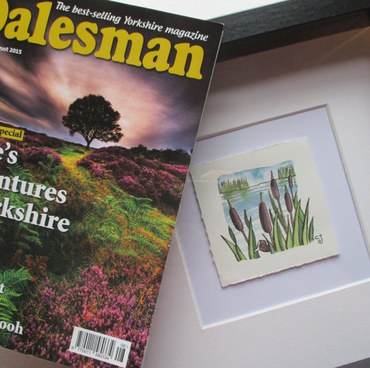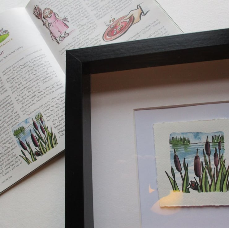 Watercolour illustration originally created for a magazine, signed by the artist, framed in a chunky black square frame, ready to hang, with clear plastic rather than glass.