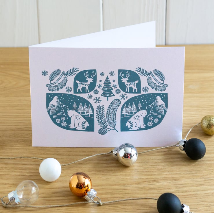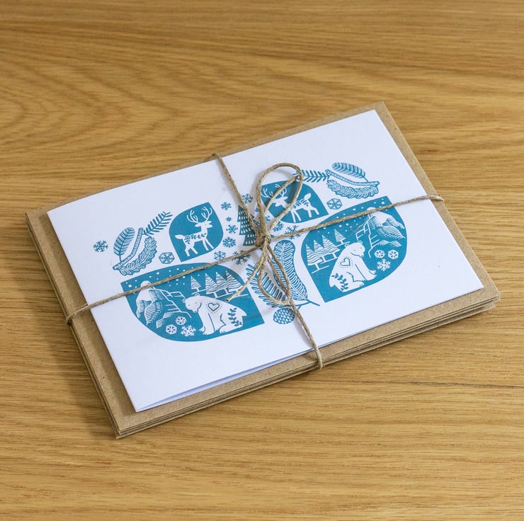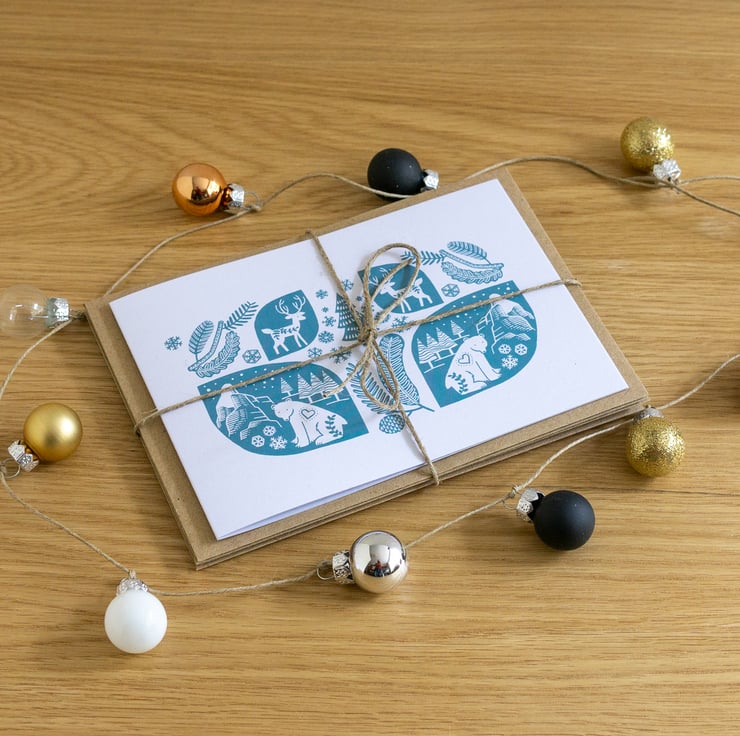A set of four Scandi Christmas cards, printed onto nice uncoated card each with a Kraft envelope. Size A6 landscape (148mm x 105mm). You will receive four cards tied up with twine. They are all the same design, as pictured.
