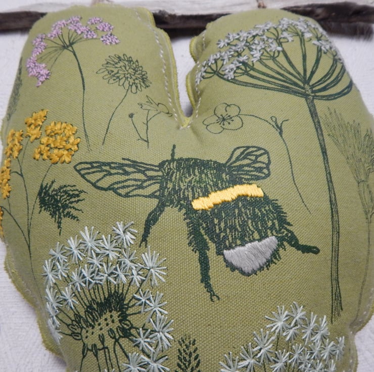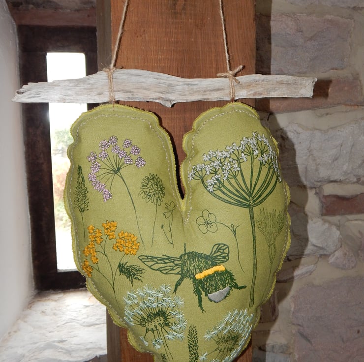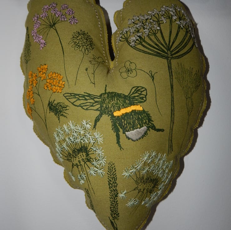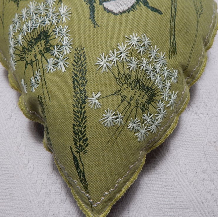 The heart is a green cotton and measures 38 cm in length by 30 cm in width and has a depth of approximately 14cm. The front has been screen printed with achillea, cow parsley, dandelion clock, grass, buttercup and scabious. There is a bumble bee in the middle of the flowers. The achillea, cow parsley and dandelion clocks have been hand embroidered. The bands of the bee have also been embroidered in yellow and grey. There is one line of decorative machine stitching in silver/cream silk thread to the edge of the heart.