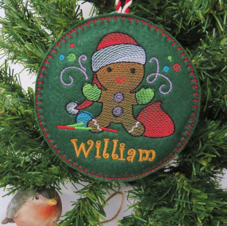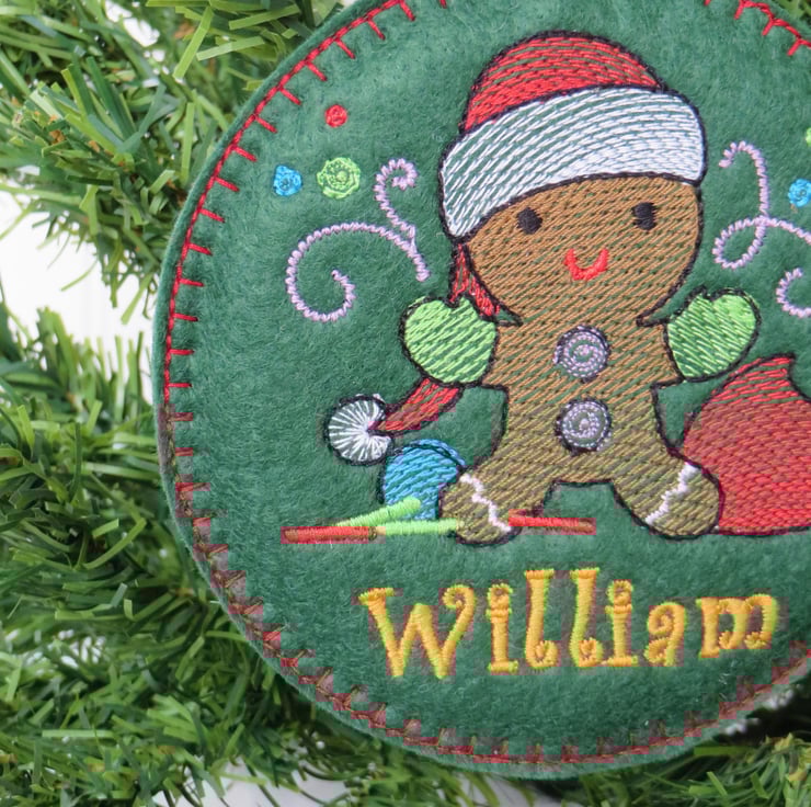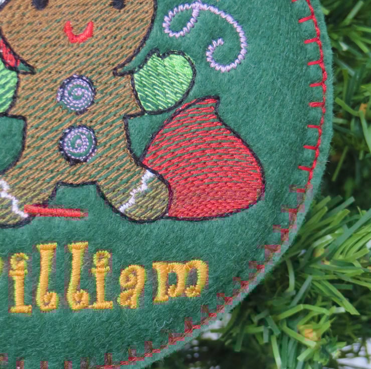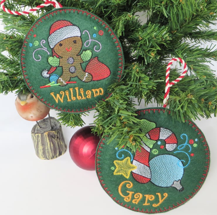 The decoration is made from green felt and comes with a choice of vintage style sketch design machine embroidered on the front and is personalised with any name of your choice. Choose from a cute gingerbread santa or tree bauble and candy stick. It is softly padded and finished with a classic blanket stitch around the edge. Each decoration is approx. 4 1/2" in height and has a pretty christmas ribbon loop with which you can hang it anywhere around your home.