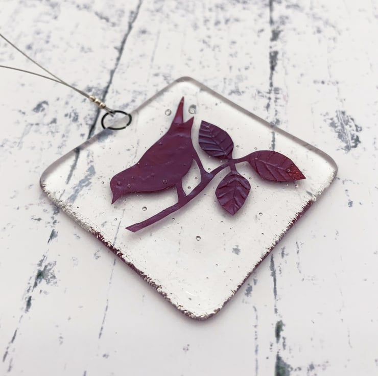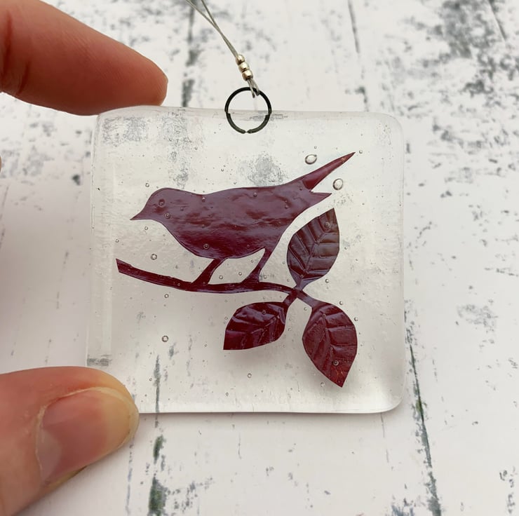To make these glass hangings, I start with cutting 2 squares of transparent art glass. I then use a scapel and cut my delicate bird and twig design out of very thin copper foil. I then make a little wire ring to hang the square. The ring and copper bird are sandwiched between the glass squares and fired overnight in my kiln. The heat of the kiln turns the copper a lovely deep red colour. When completely cooled and washed, I add the hanging wire.
