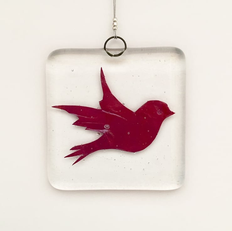 Fused glass hanging with copper foil. Transparent glass with handcut copper foil bird captured inside. The copper foil is cut individually by me with a scalpel. When it's fired overnight in my kiln, the copper turns to a lovely deep red colour. Each bird is handcut, therefore no 2 are exactly the same. One Supplied.