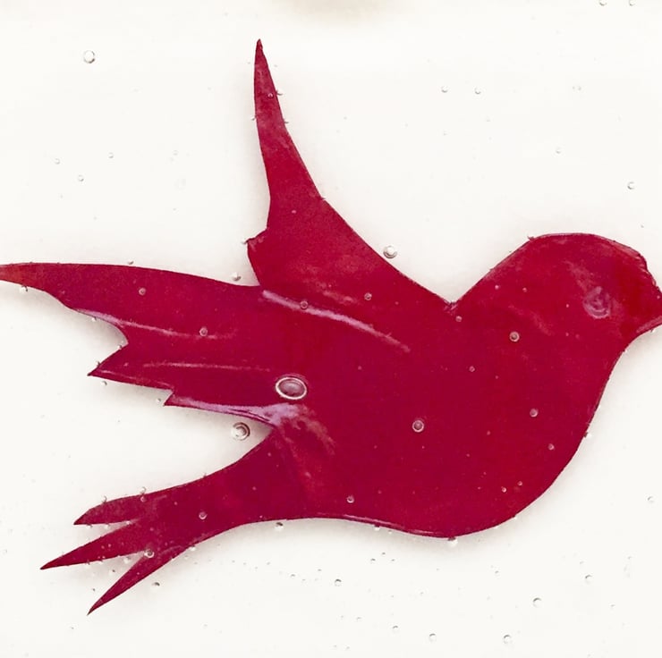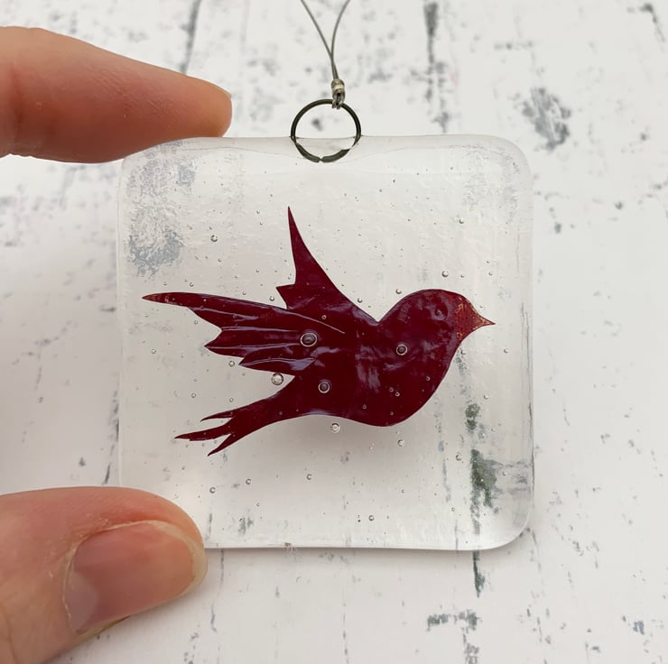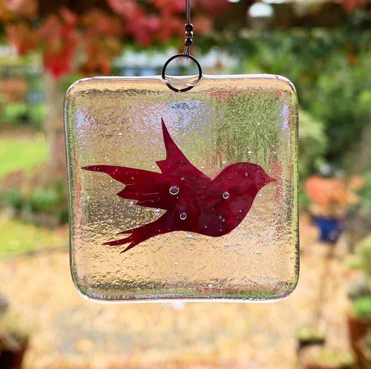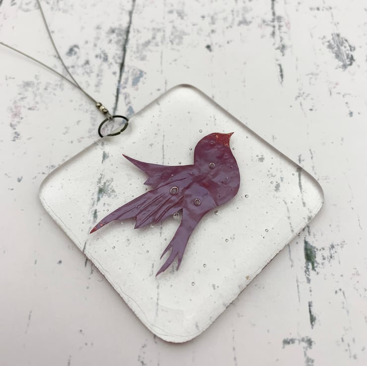 Fused glass hanging with copper foil. Transparent glass with handcut copper foil bird captured inside. The copper foil is cut individually by me with a scalpel. When it's fired overnight in my kiln, the copper turns to a lovely deep red colour. Each bird is handcut, therefore no 2 are exactly the same. One Supplied.