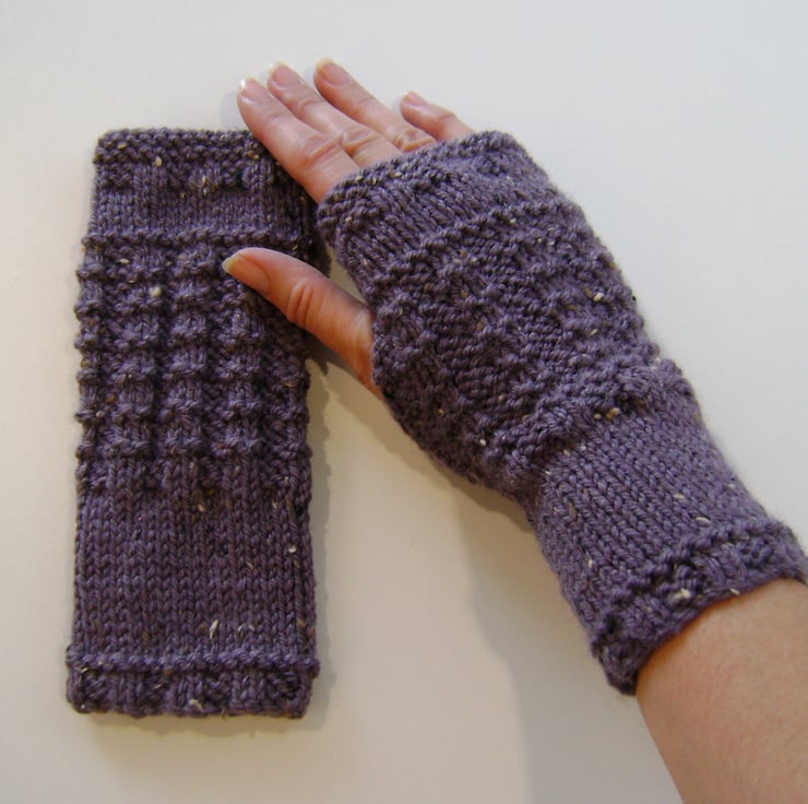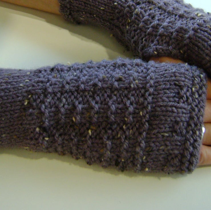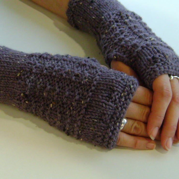 These lovely and soft dusky grape cosy fingerless mittens / wrist warmers / gloves are knitted with a pretty waffle pattern and have a touch of tweed in them. They are made from 25% Aran wool and are 8 inches long.