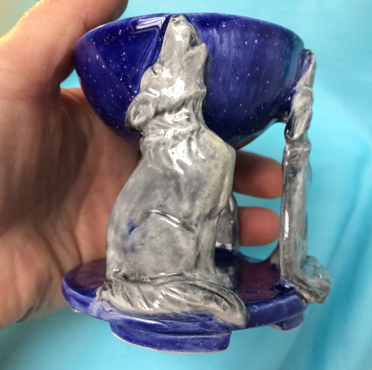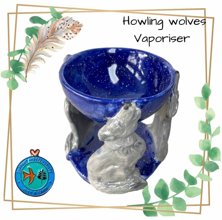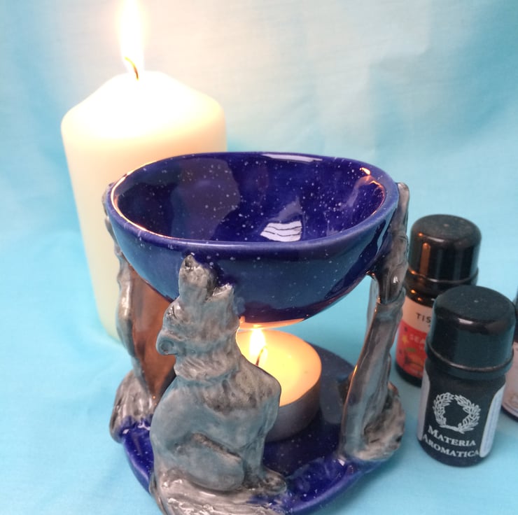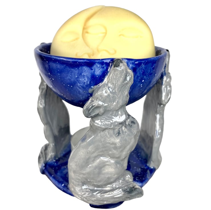 Handmade ceramic oil burner, also suitable for scented melts ( not included). Three howling wolf figures created from my own original design, support the bowl. Small feet on the base help disperse heat.