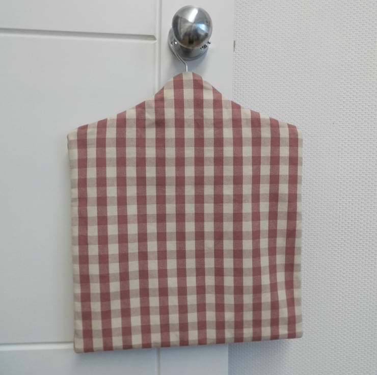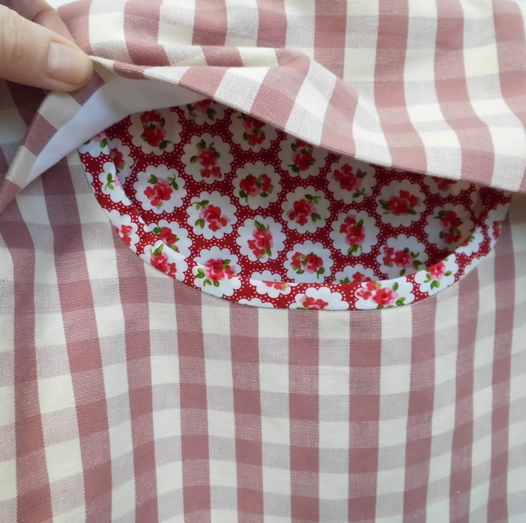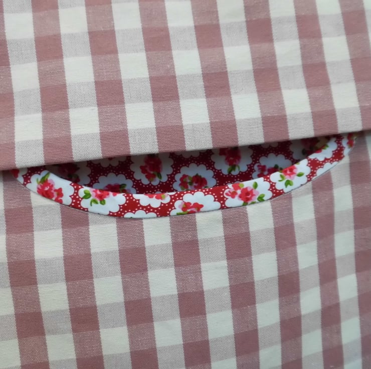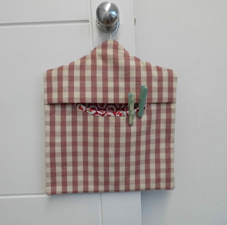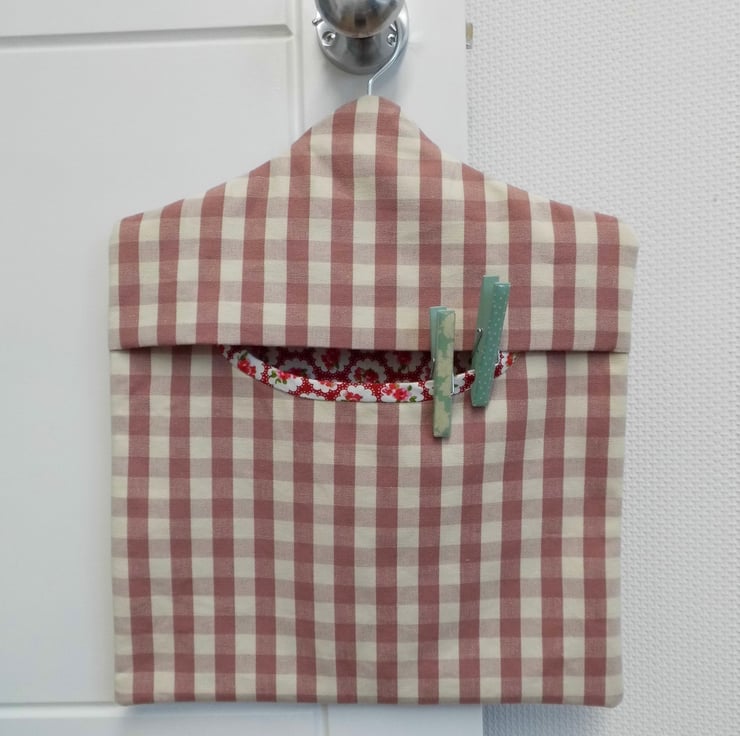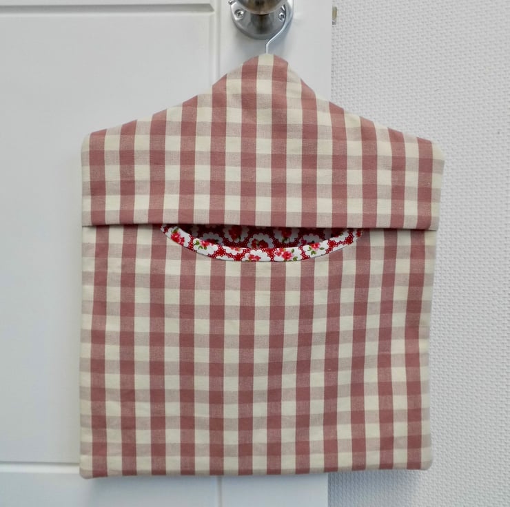 A fully lined peg bag carefully made using a raspberry pink and cream gingham. The back is lined with a red bubble rose printed cotton and you can see this through the opening. The front is lined with white cotton fabric.