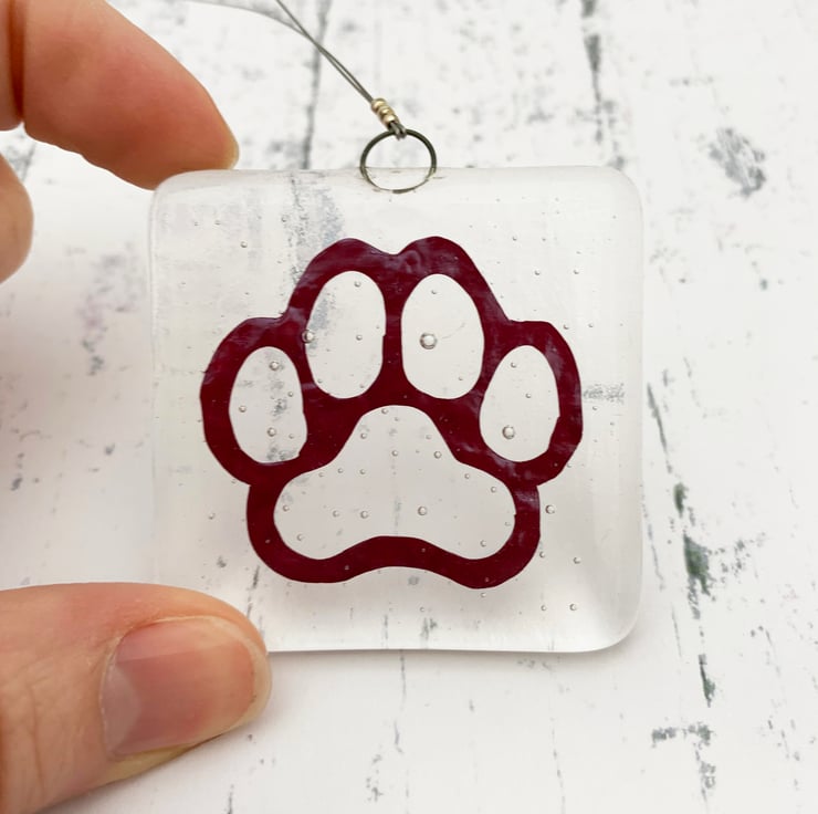 To make these glass pawprint I start with cutting 2 squares of transparent art glass. I then use a scapel and cut my delicate pawprint design out of very thin copper foil. I then make a little wire ring to hang the square. The ring and copper paw are sandwiched between the glass squares and fired overnight in my kiln. The heat of the kiln turns the copper a lovely deep red colour. When completely cooled and washed, I add the hanging wire.
