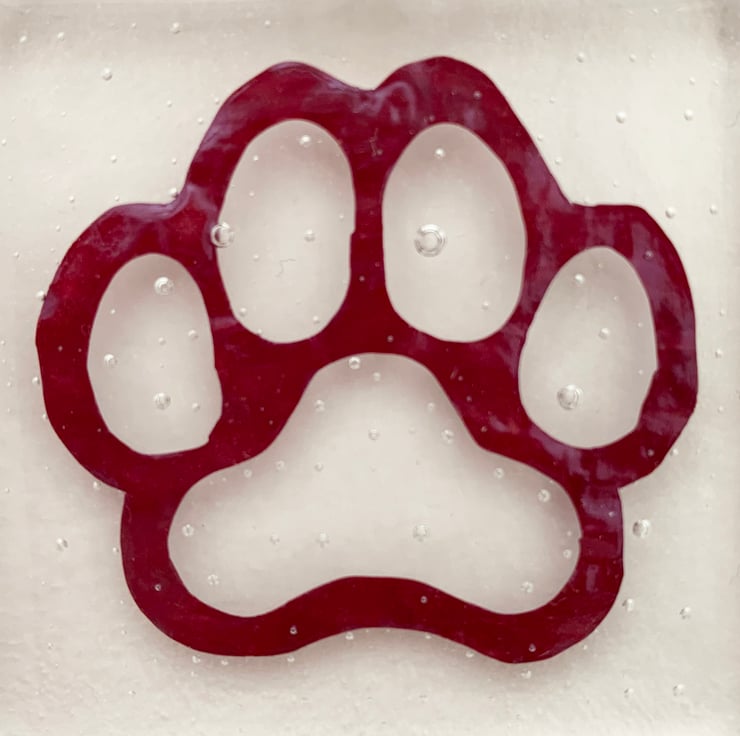 Transparent glass with handcut copper foil pawprint captured inside. Each pawprint is handcut, therefore no 2 are exactly the same. One Supplied.
