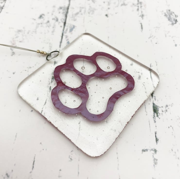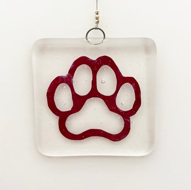 Fused glass hanging with copper foil pawprint design. These fused glass squares make wonderful small gifts, especially for pet lovers and look lovely either hung in a window or on your Christmas tree.