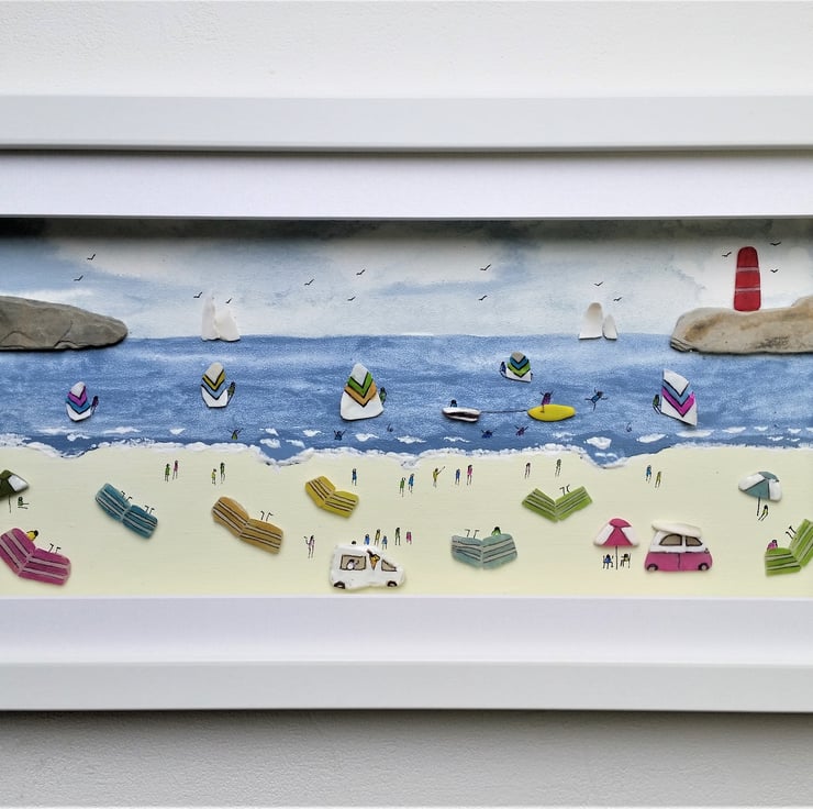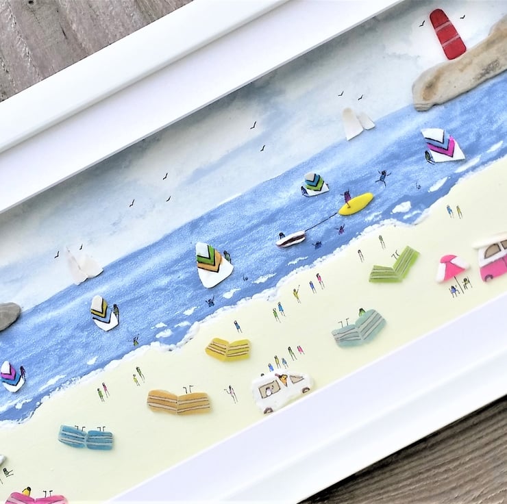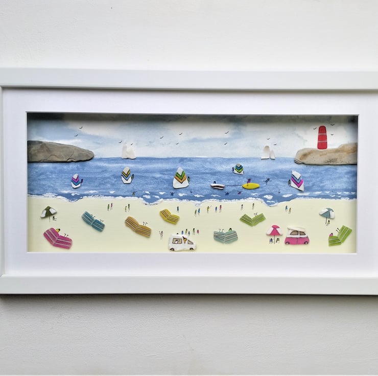 This Cornish summer beach scene was created using tiny pieces of beach combed sea glass and sea shell collected from Cornish beaches, and set inside an impressive 24cm x 44cm white glazed box frame that is all ready to hang on your wall.