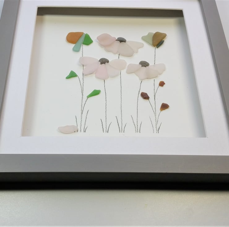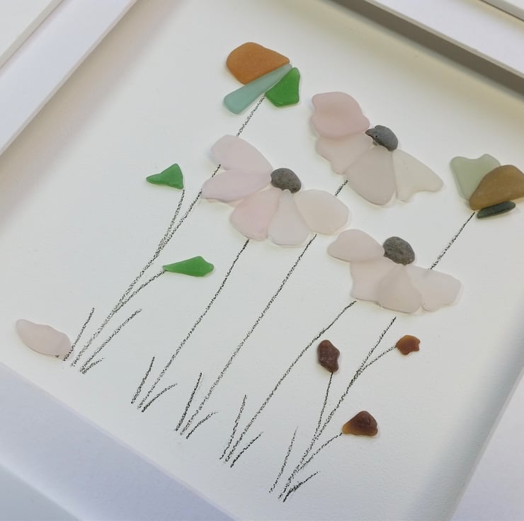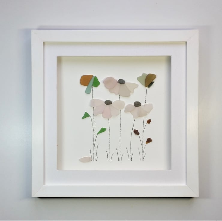 Sea glass flowers created from nuggets of ocean shaped and smoothed Cornish sea glass, left in their natural, freshly picked from the beach, colours and set inside a 29cm square white glazed box frame that is all ready to hang on your wall.