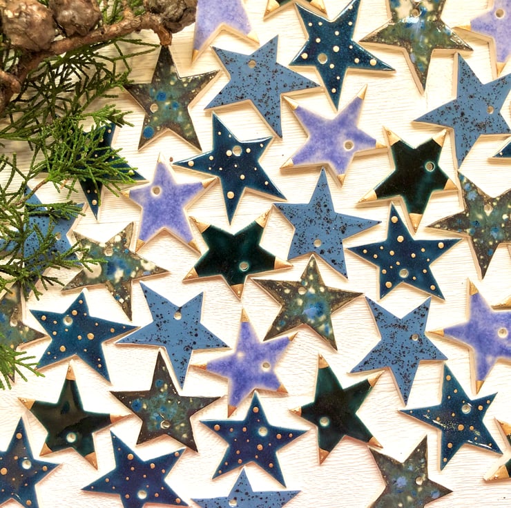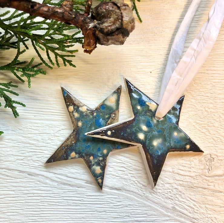 A ceramic star decoration made with a white earthenware clay and rustic blue-green crystalline glaze, and finished with a crisp white paper string.