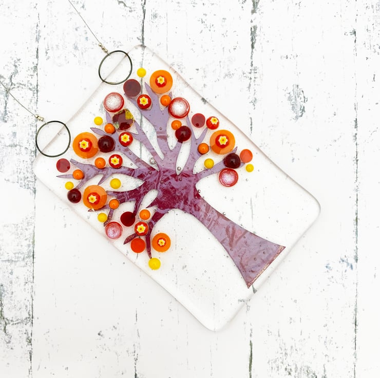 Fused glass hanging tree suncatcher with beautiful rich Autumn colours. Inspired by my love of nature and wildlife and the big mature trees that I see when walking my dog. A beautiful gift, it looks lovely in a window, giving a splash of fresh colour on these cold Winter days.