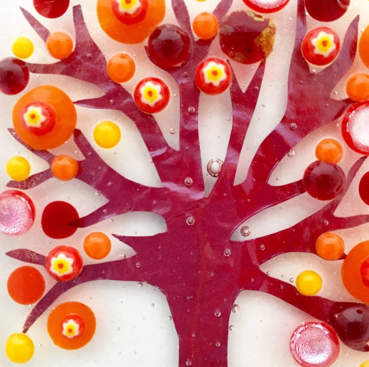 I hand cut copper foil with a scalpel to make the trunk and branches of the tree and sandwich it between 2 layers of art glass. This is the fused slowly overnight in my kiln. I then add coloured and dichroic dots which I have made previously to give some added interest to the design. A second firing is done overnight the next day to tack fuse the dots onto the design, so that they stand proud of the glass, giving it a 3D effect.
