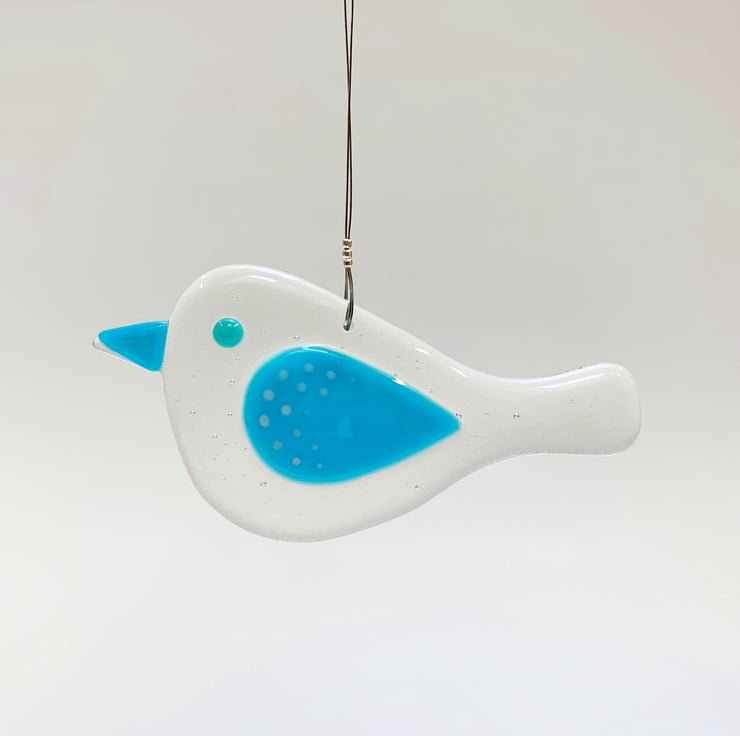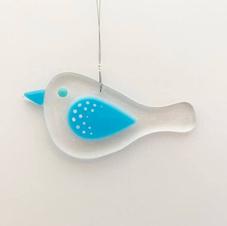 Fused glass hanging bird suncatcher. These birds have transparent bodies and a decorated opaque wing. They look lovely in a window and make a wonderful gift.