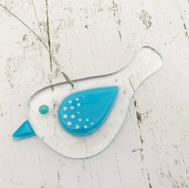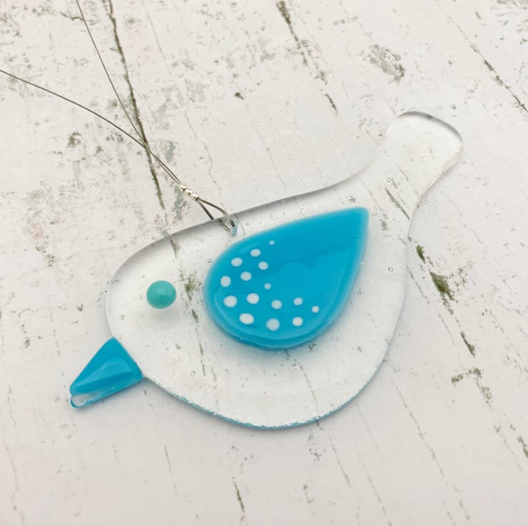 To make this bird, I have hand cut 2 bird shapes and fused them overnight in my kiln. The next day, I have added a beak and an eye and a turquoise opaque wing which I've decorated with white enamel spots. The bird then goes back into the kiln again to tack fuse the eye, beak and wing onto the body. This time, the kiln is set on a lower temperature so the wing, eye and beak are slightly proud from the glass, giving it a 3D effect. Body is transparent glass, wing, eye and beak are opaque turquoise glass.