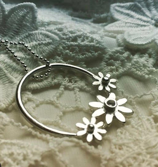The Flower Garden Silver pendant is one of the original popular pieces. It is a unique eye catching piece. A handcrafted hoop (40mm approx) from solid recycled sterling silver with three different kinds of flower circling around. The design shown has an daffodil and two daisies.