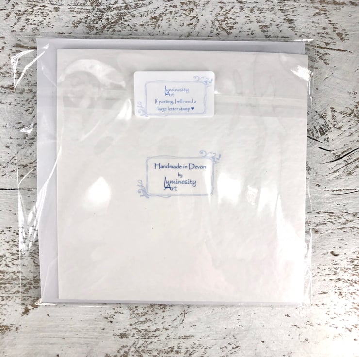 The card is 12.5x 12.5cm (13cm in envelope) and will post as large letter at £1.06 first class.