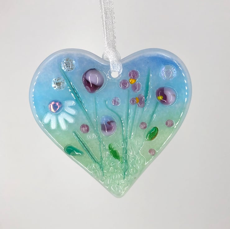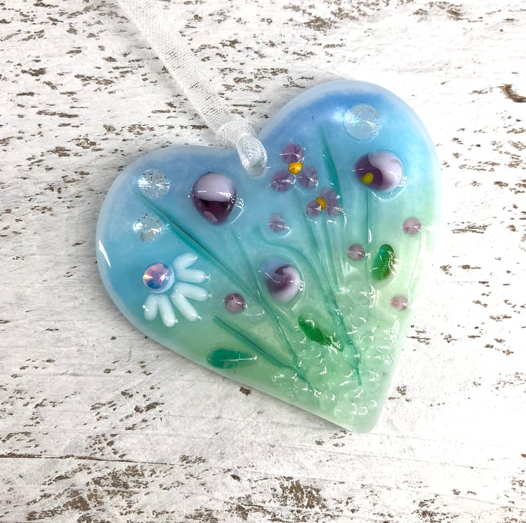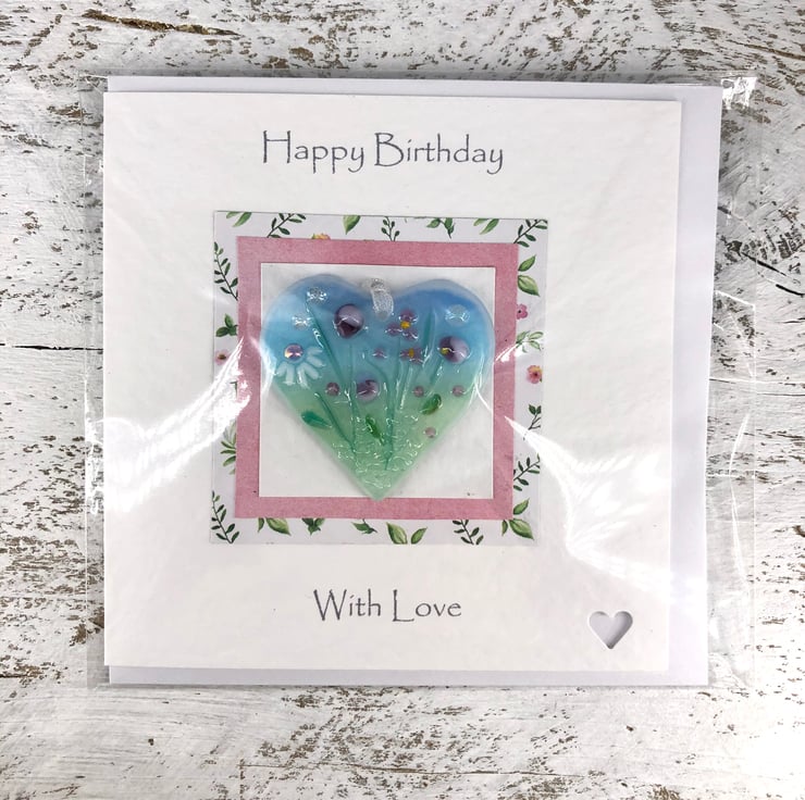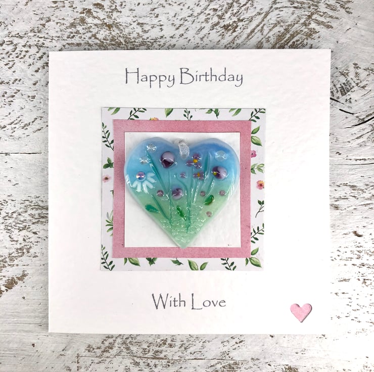 A lovely handmade card with a gorgeous glass heart with purple meadow flowers attached to it - the perfect card and gift in one!