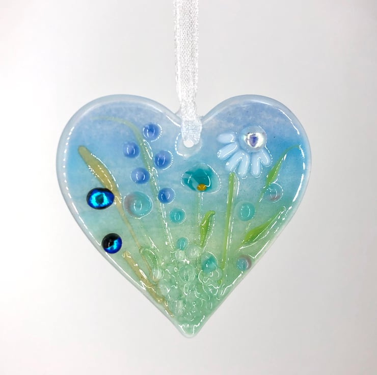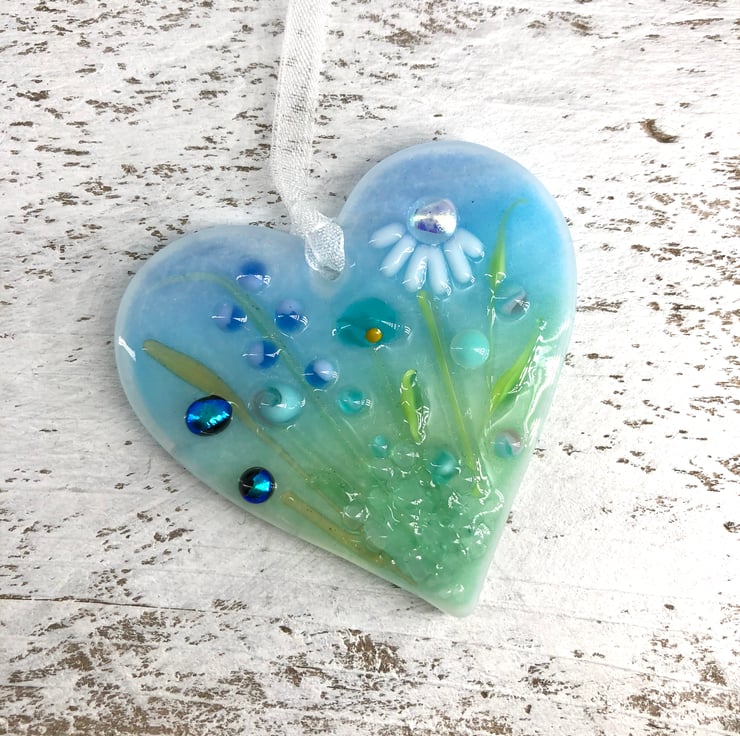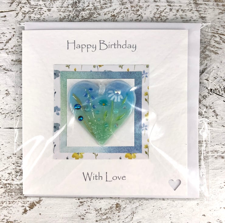 A lovely handmade card with a gorgeous glass heart with blue & turquoise meadow flowers attached to it - the perfect card and gift in one!