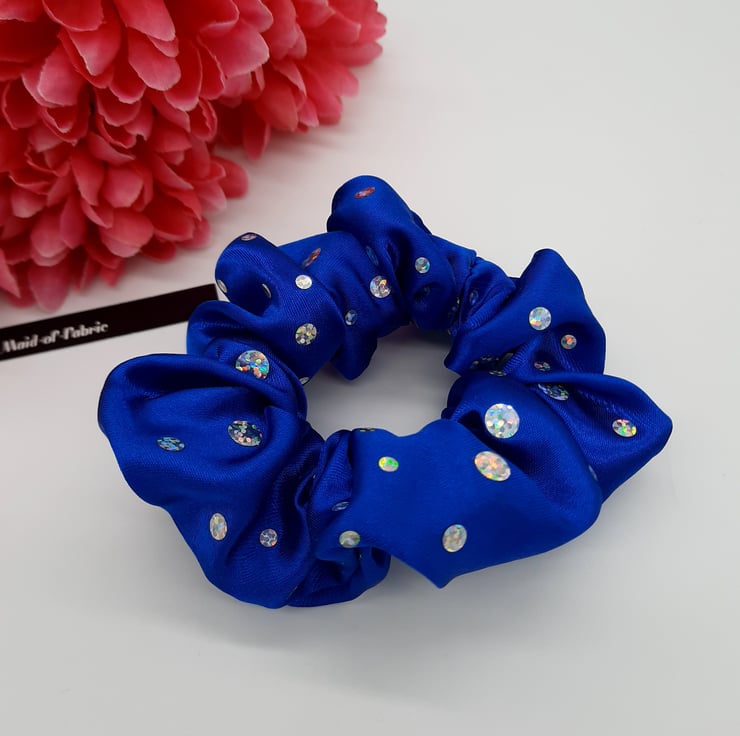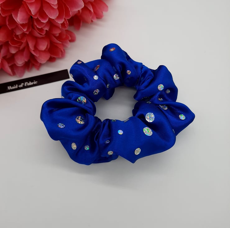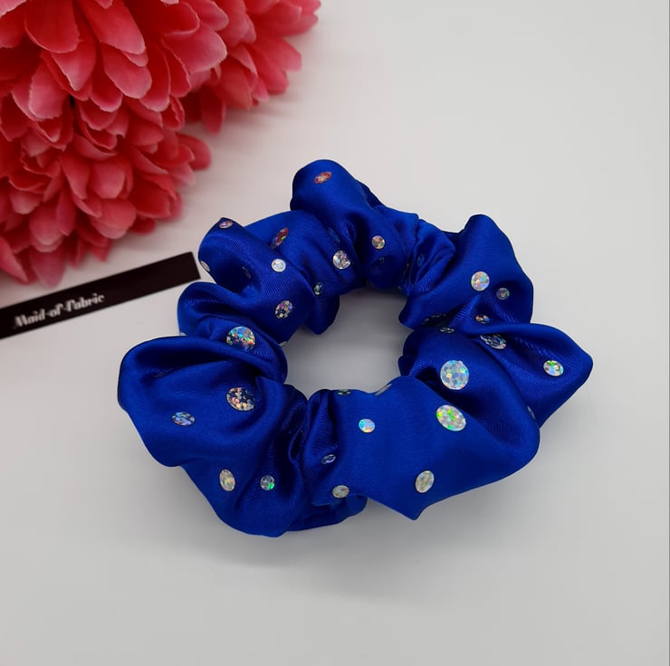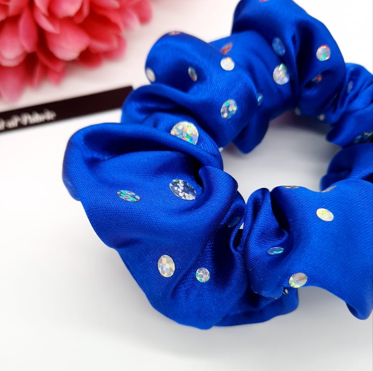 Scrunchie made using a royal blue holographic dot sparkles fabric.