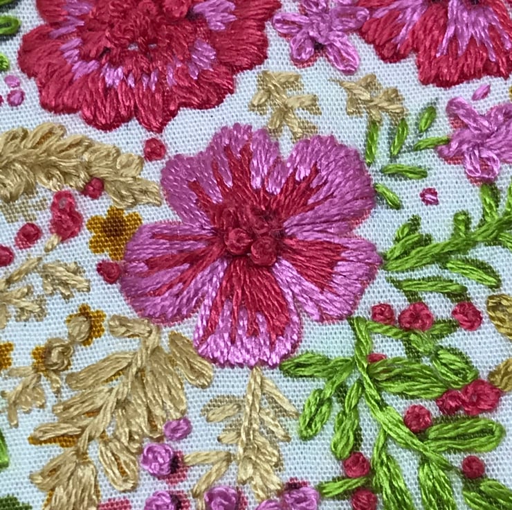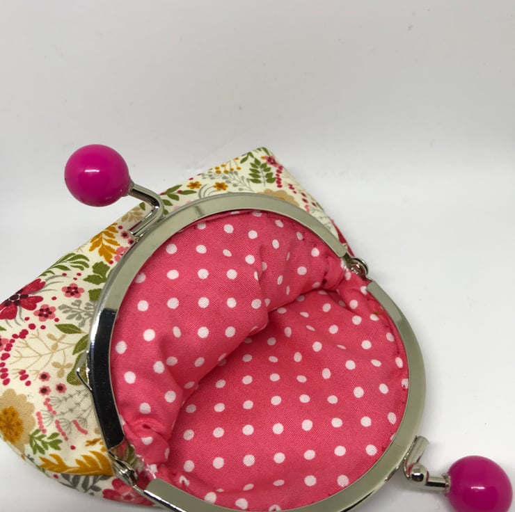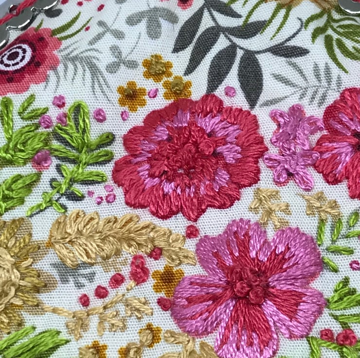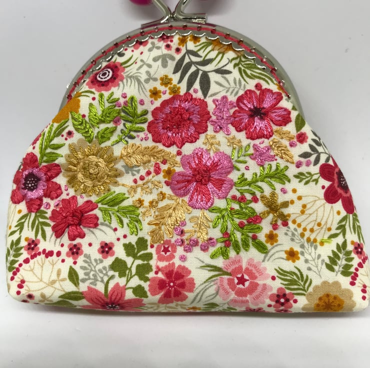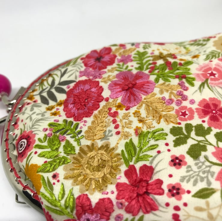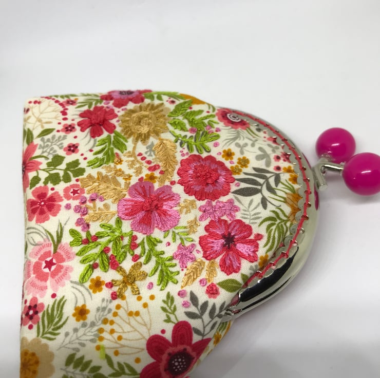 A beautifull pink and coral shades, floral embroidered Clasp coin purse. I have embroidered into the printed cotton on a few of the flowers. The printed flowers have been embellished with my hand embroidery in sympathetic colours to jazz up this fabulous printed cotton fabric. The back of this purse is the same patterned fabric but with no embroidery.