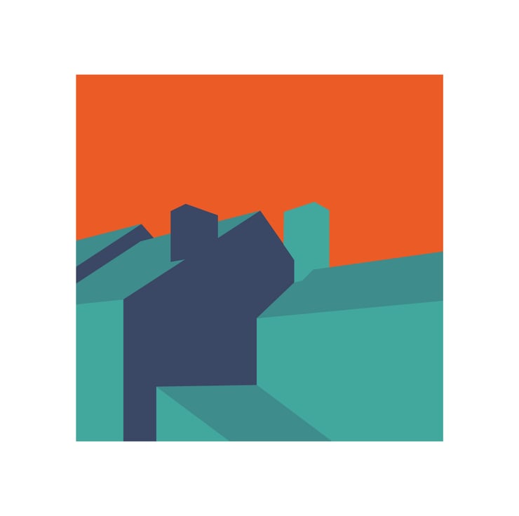 As much as I would like a panoramic scene of craggy mountains, rolling hills and shimmering lakes, this is what I have and love – the view from my home studio looking over the backs of houses and into stone paved yards – with an orange sky! Street geometry rules.