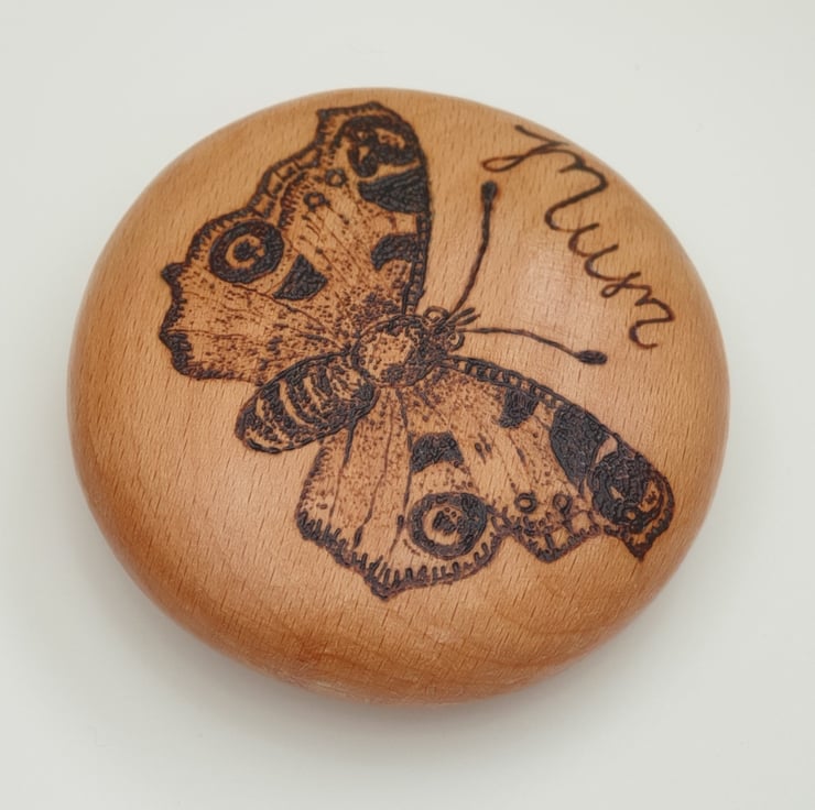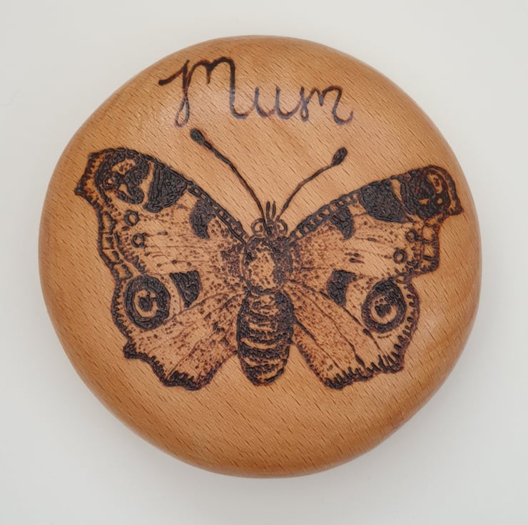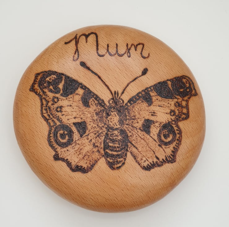Lovely, round, wooden tactile pebble featuring a handburnt butterfly and the word Mum making a unique present for Mum's birthday or Mother's Day. The pebble has been finished with several coats of satin varnish and will be supplied in a pretty organza bag, with ribbon and a Crafty Nature tag.